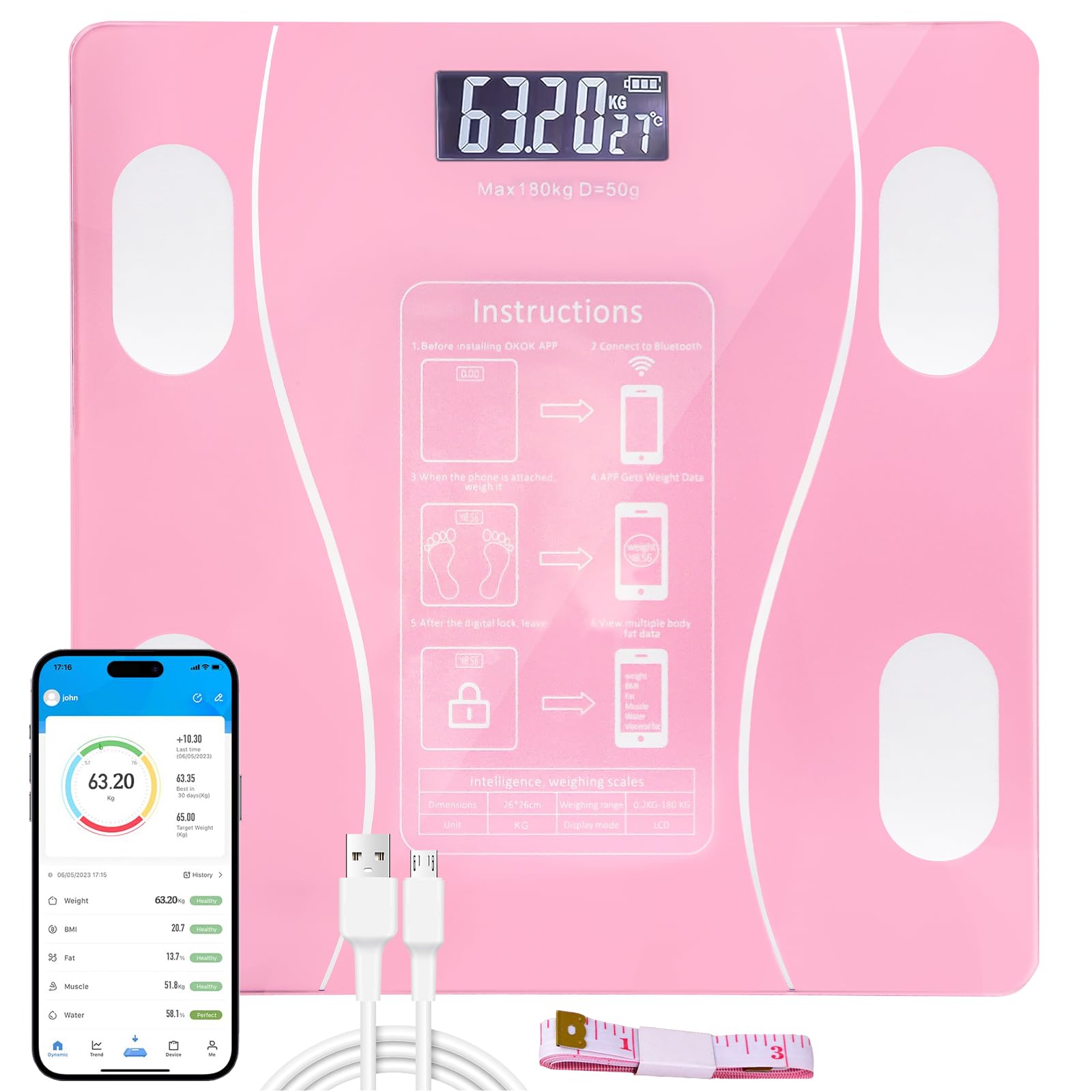 Conectividad Bluetooth inteligente : se sincroniza sin esfuerzo con una aplicación inteligente para realizar un seguimiento de su peso y sus tendencias de salud a lo largo del tiempo.